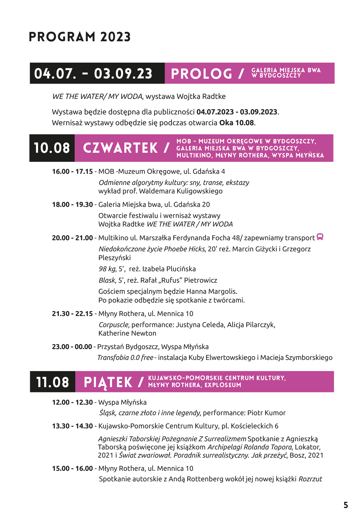 Dziesiąta, jubileuszowa edycja festiwalu odbyła się w dniach 10–13 sierpnia 2023 roku w Bydgoszczy pod hasłem „TRANS”, które zaproponowała Anda Rottenberg. Program eksplorował szeroko rozumianą transgresję, odmienne stany świadomości oraz zacieranie granic między różnymi dyscyplinami sztuki, nauką i codziennością. Jednym z najważniejszych wydarzeń była kuratorowana przez Roberta Kuśmirowskiego wystawa EXP(L)O w bydgoskim Exploseum, badająca możliwość emocjonalnej regeneracji terenów po dawnej fabryce broni. W Galerii Miejskiej bwa zaprezentowano ekspozycję Wojtka Radtke MY WODA, a w hołdzie dla zmarłego Marcina Giżyckiego odbył się pokaz jego filmu Niedokończone życie Phoebe Hicks. Całość uzupełniły liczne performansy, debaty oraz występy Społecznego Chóru Czarnego Karła, kontynuujące tradycję nieprzypadkowych spotkań artystycznych.